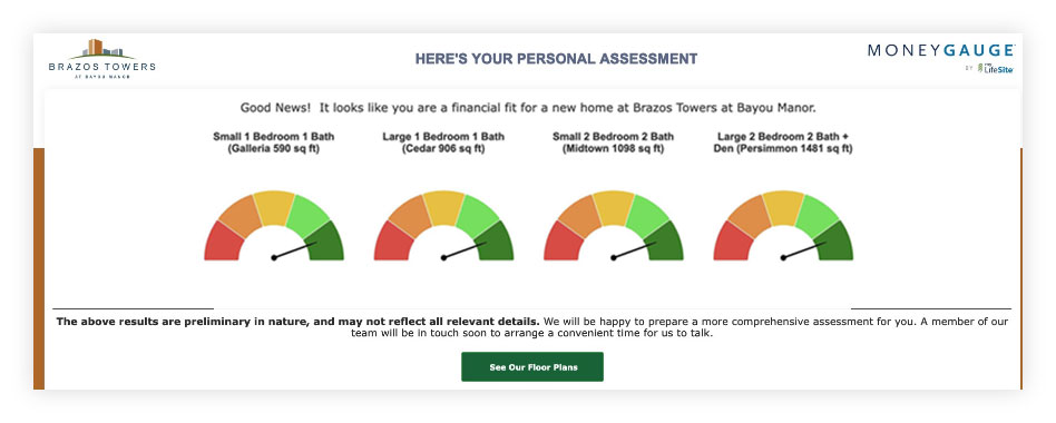 Simply answer nine short questions about things like your current home equity, retirement assets, and more – our affordability calculator will assess your situation and provide you with a range of floor plan options that match your specific financial situation.